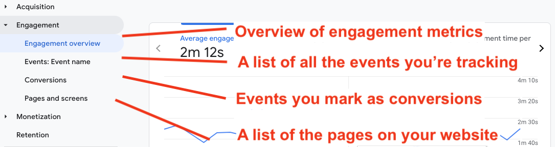 The engagement section is similar to the Content section in UA. The reports tell you how people interact with your site.