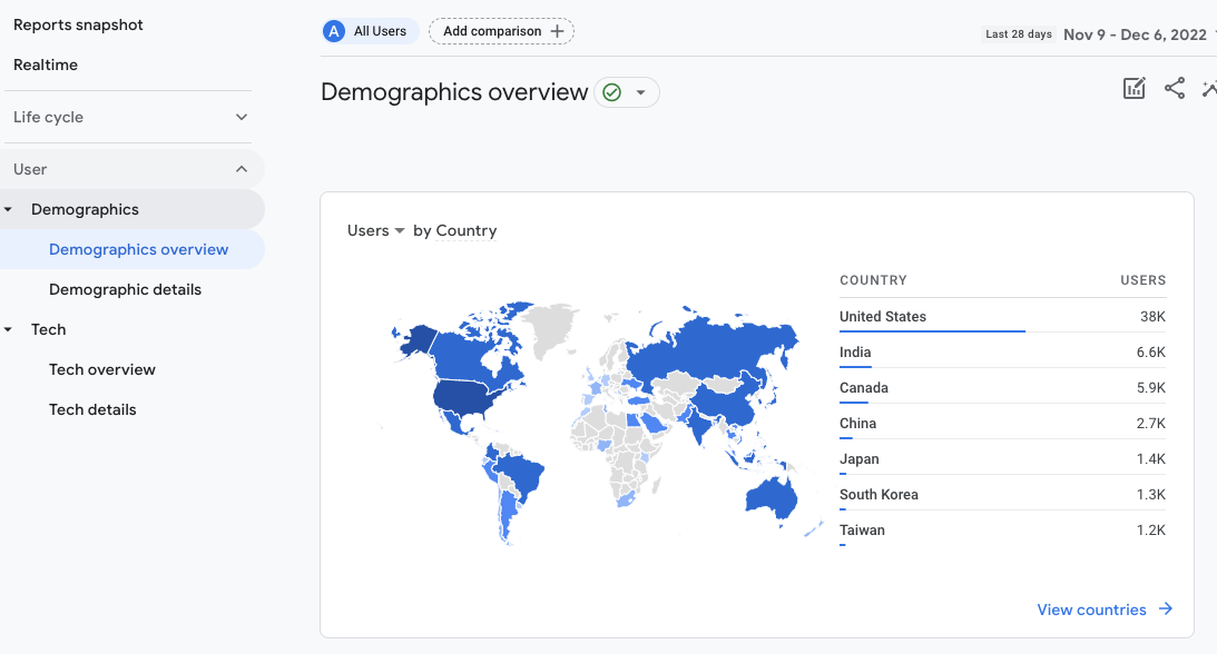 The demographic reports cover things like countries, languages, ages, gender, and more. The tech reports cover devices, OSs, browsers, and more.