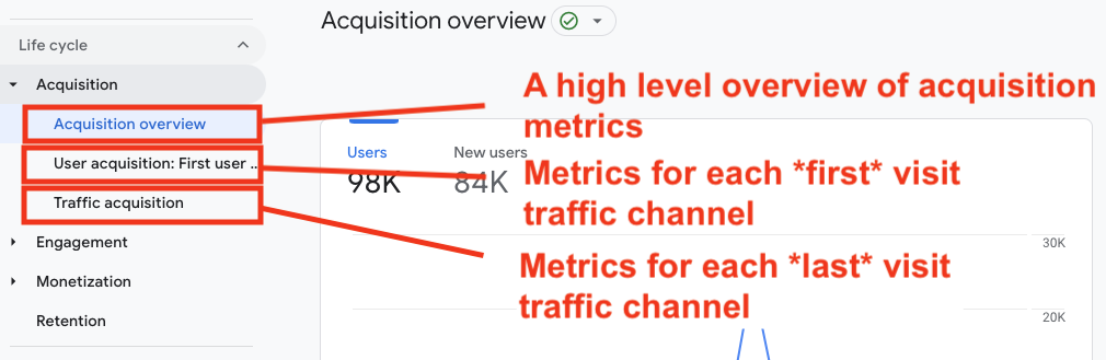 Traffic acquisition is similar to the ‘Channels’ report in UA, it measures the last channel users visit your site from.