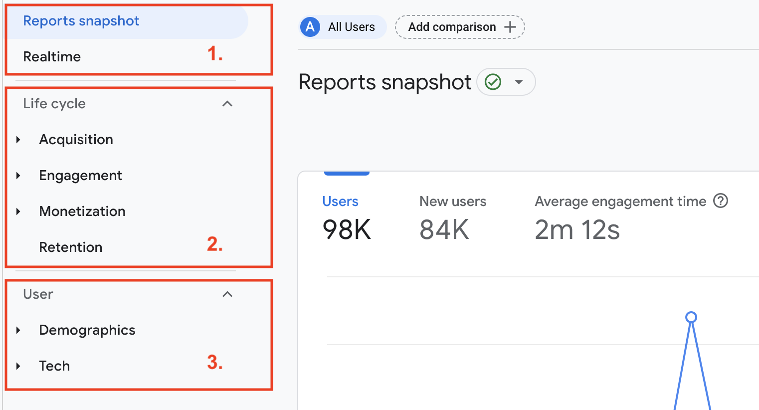 At the bottom of the Reports section, there’s the User section, which is a slimmed-down version of the Audience section in Universal Analytics.