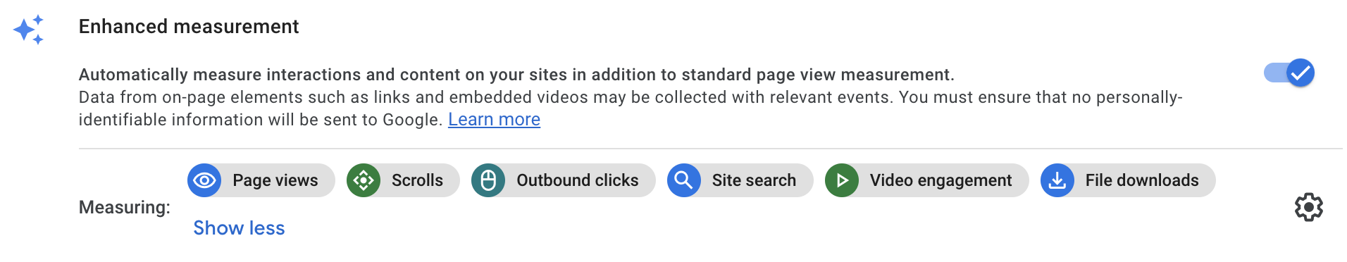 By toggling on a button you can automatically measure events in Google Analytics 4 (GA4). In previous versions of GA setting these events up would have required adding code to your site or some setup in Google Tag Manager.
